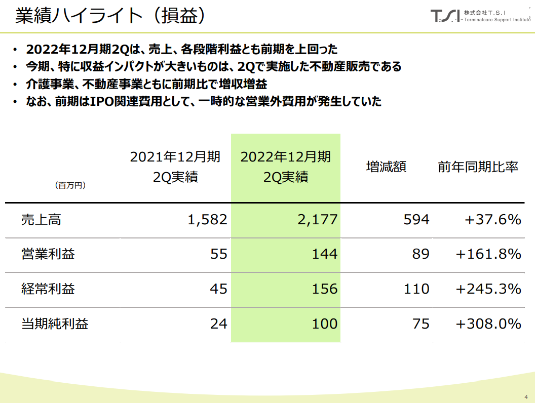 12日に発表されたT.S.Iの2022年12月期第2四半期決算は良かったです。