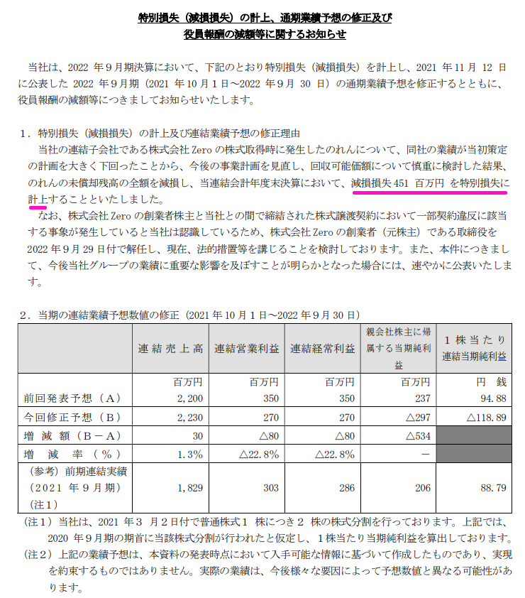 また、2022年9月期にのれんの未償却残高を全額を減損し、特別損失を計上するということは、来期以降の減価償却費が減るということであり、来期以降はそれだけ利益が増えるということです。